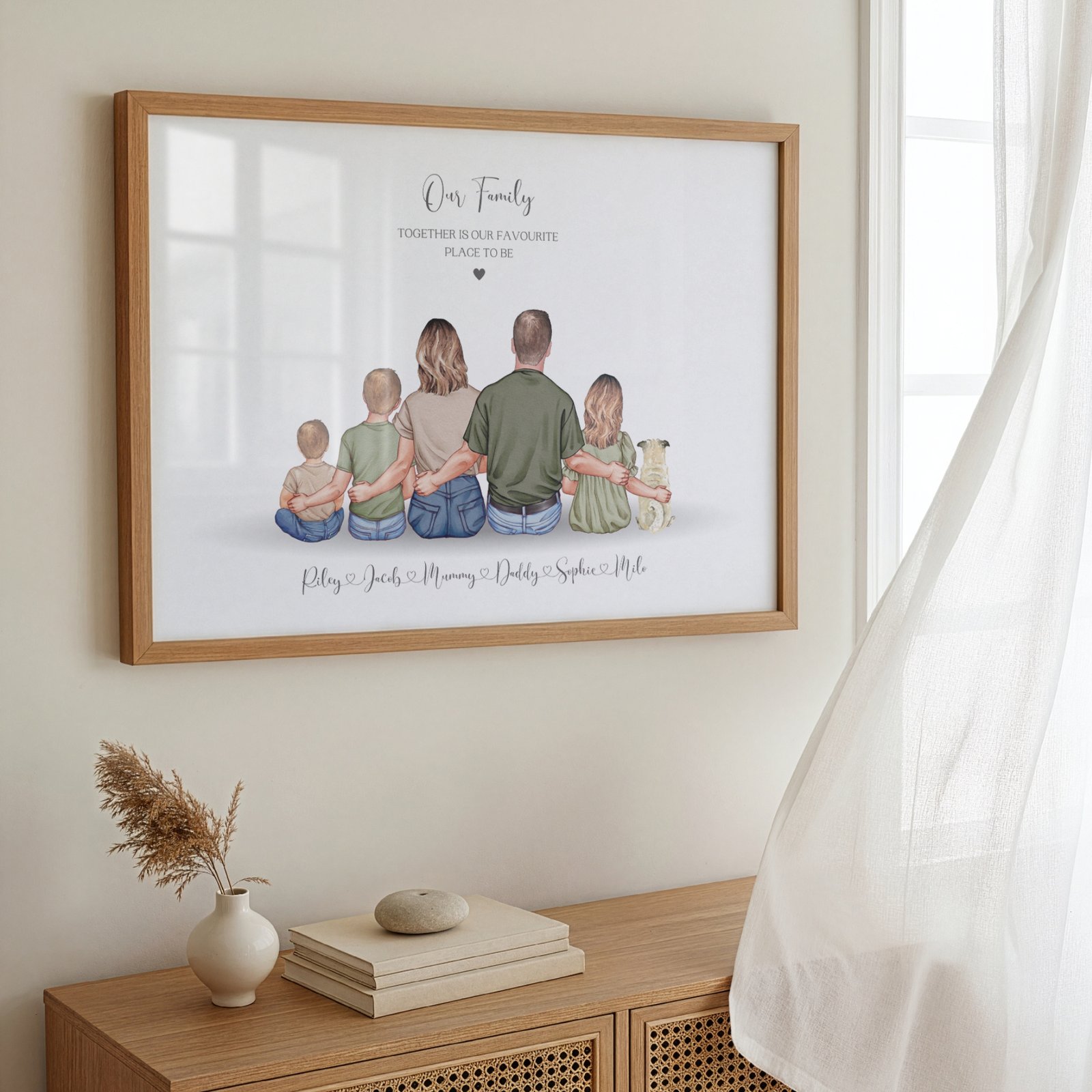 This design features a family sitting together and can be customised to include names, a quote, hairstyles, clothing colours, skin tones and even pets to create artwork that feels personal to your home.